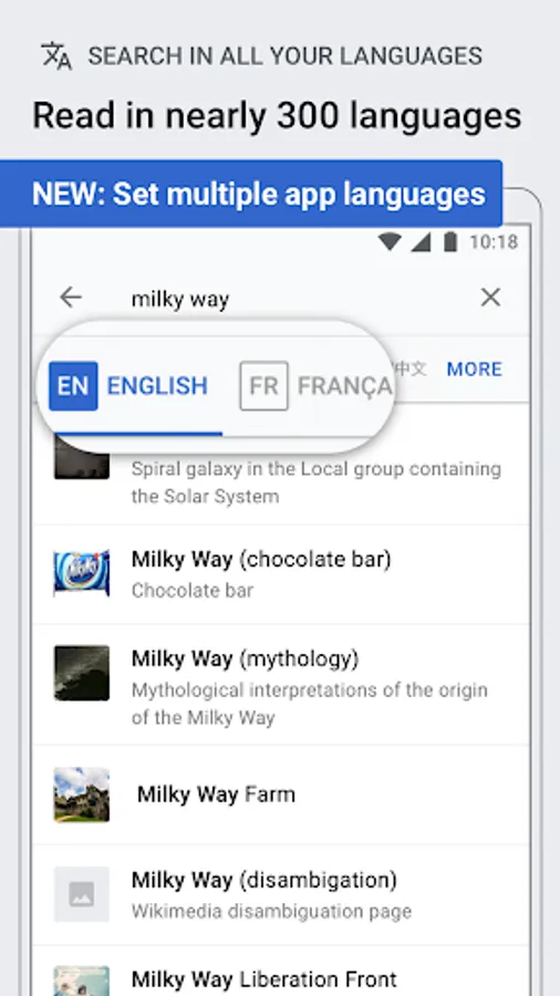 Language support: Seamlessly switch to reading any language-supported Wikipedia, either by changing the language of the current article, or changing your preferred search language while searching.