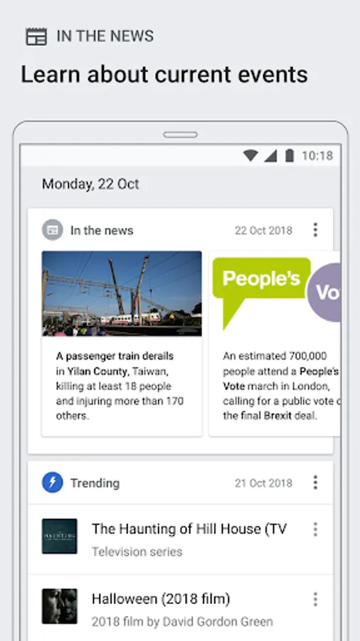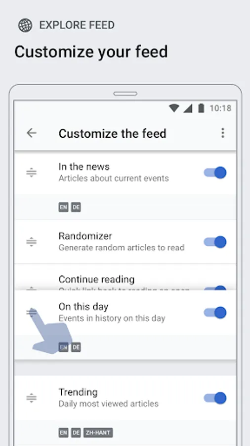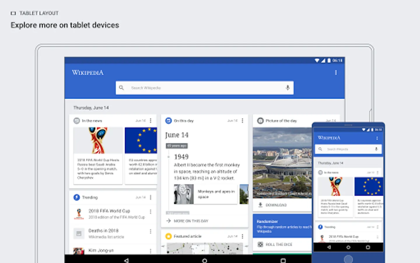 Explore feed: Recommended and constantly-updating Wikipedia content right on the home screen, including current events, trending articles, events on this day in history, suggested reading, and more. The feed is fully customizable — you can select the types of content you want to see, or rearrange the order in which different types of content appear.