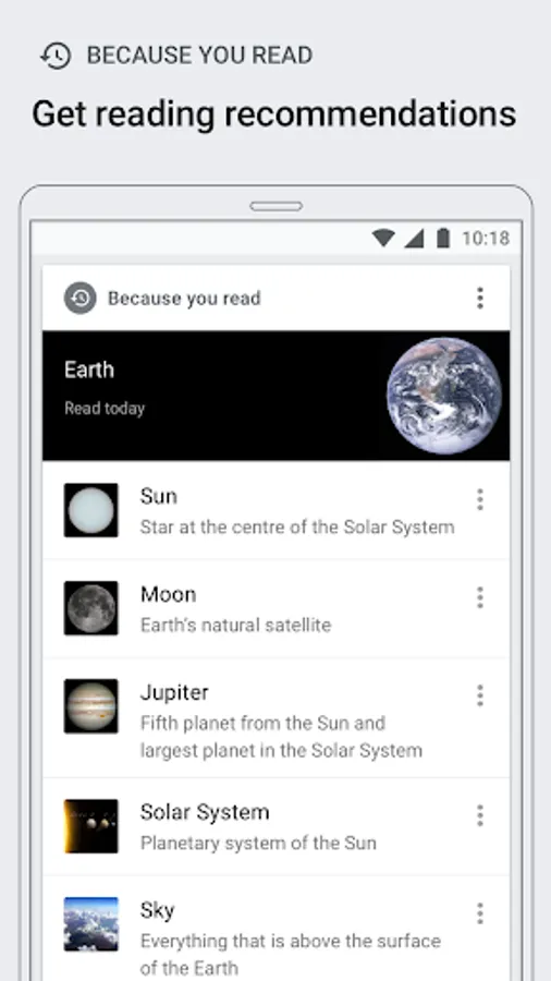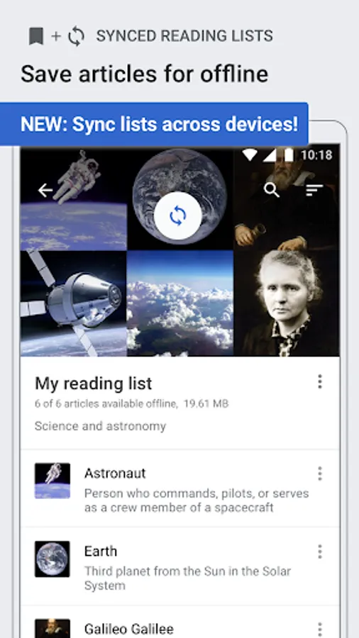 Reading lists: Organize the articles you browse into reading lists, which you can access even when you're offline. Create as many lists as you like, give them custom names and descriptions, and populate them with articles from any language wiki.