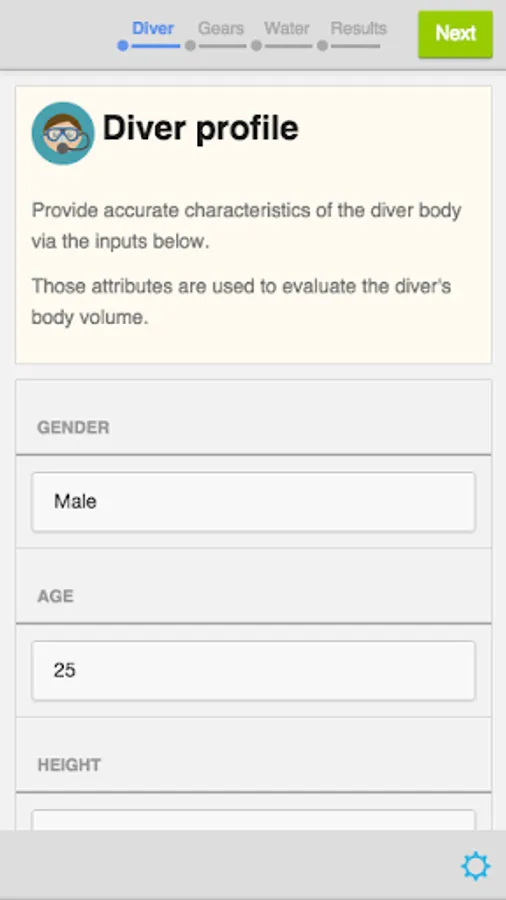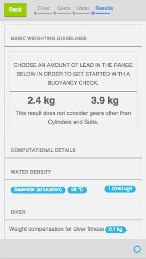 The app follows the PADI's Basic Weighting Guidelines and takes into account the buoyancy of the cylinders, the type of suits, the diver fitness (computed through a model).