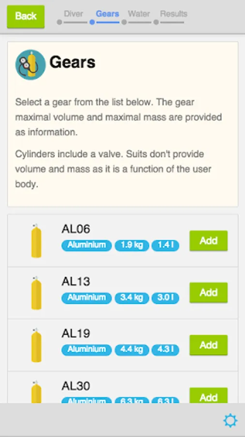 • Gears volume and mass is computed or derived from data sheets. The maximum volume and minimum mass are considered to compute the minimum amount of lead. Cylinders evaluated as being empty. Suits are approximated depending on the scuba diver body surface and wet suit thickness.