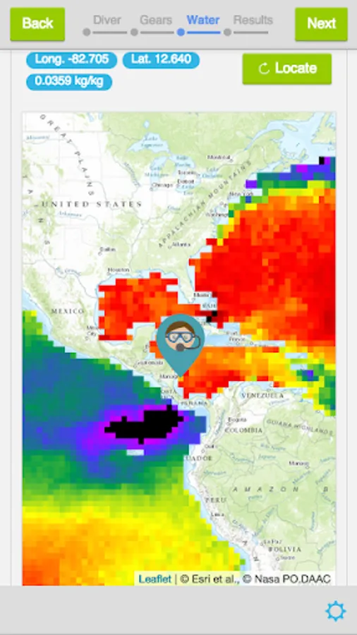 • Water density is computed via a seawater model which takes the water temperature and salinity into account (default values obtained from NASA Open Data service, based on geolocation and date)