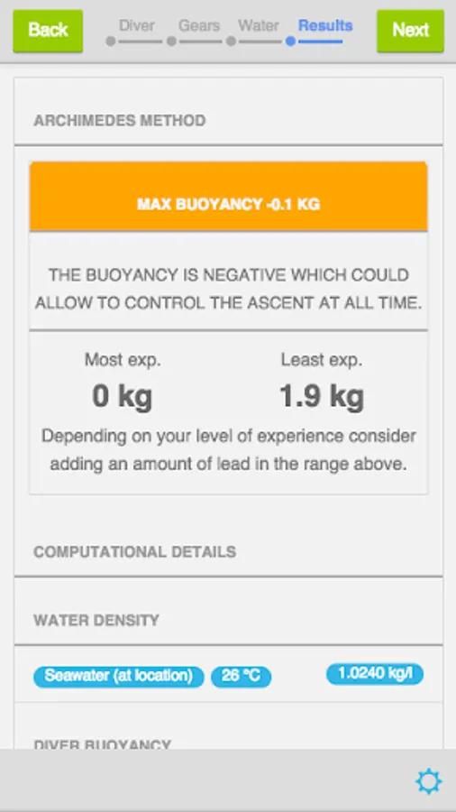 The app evaluates the minimum amount of weight required so that the scuba diver never ends up being positively buoyant during a dive with an empty BCD and lungs half full. This should allow the scuba diver to control his ascent at any time. The minimum amount of weight is related to the maximum buoyancy which is computed using the Archimedes' principle.
