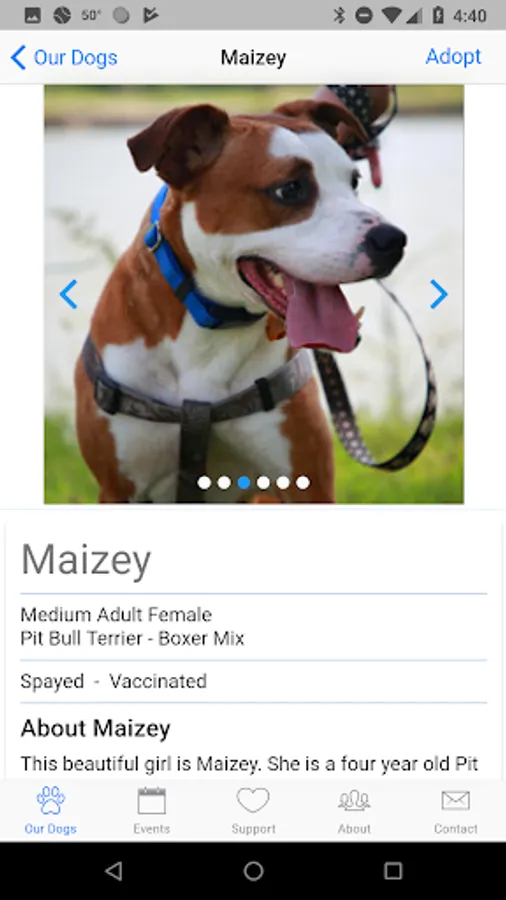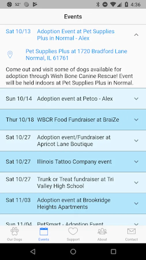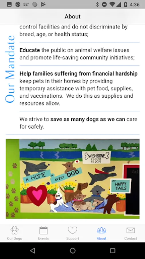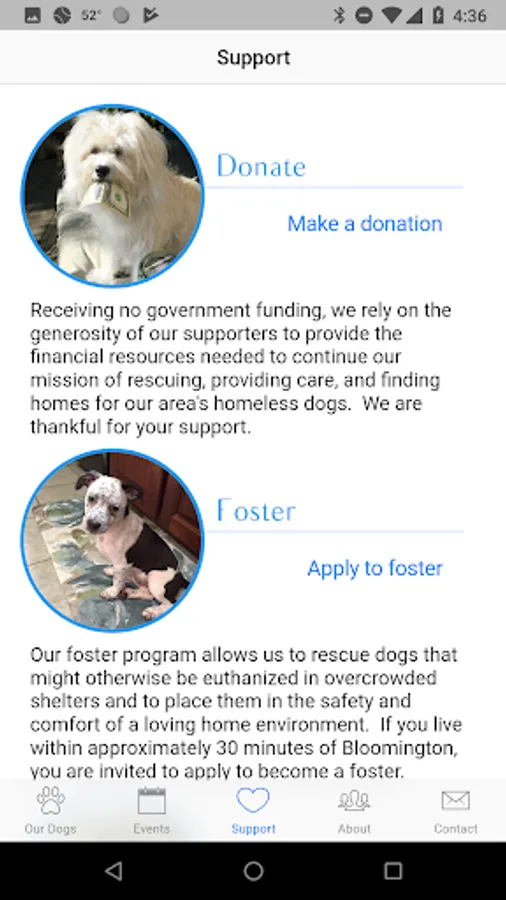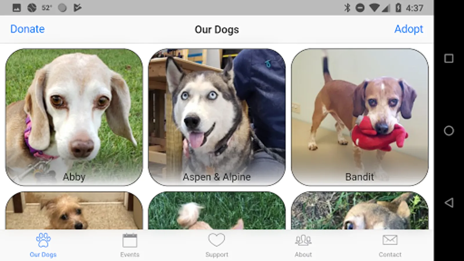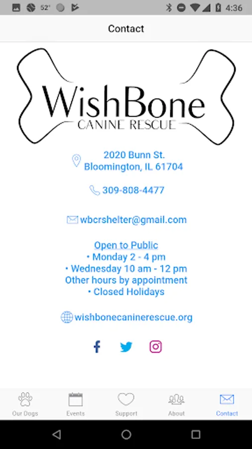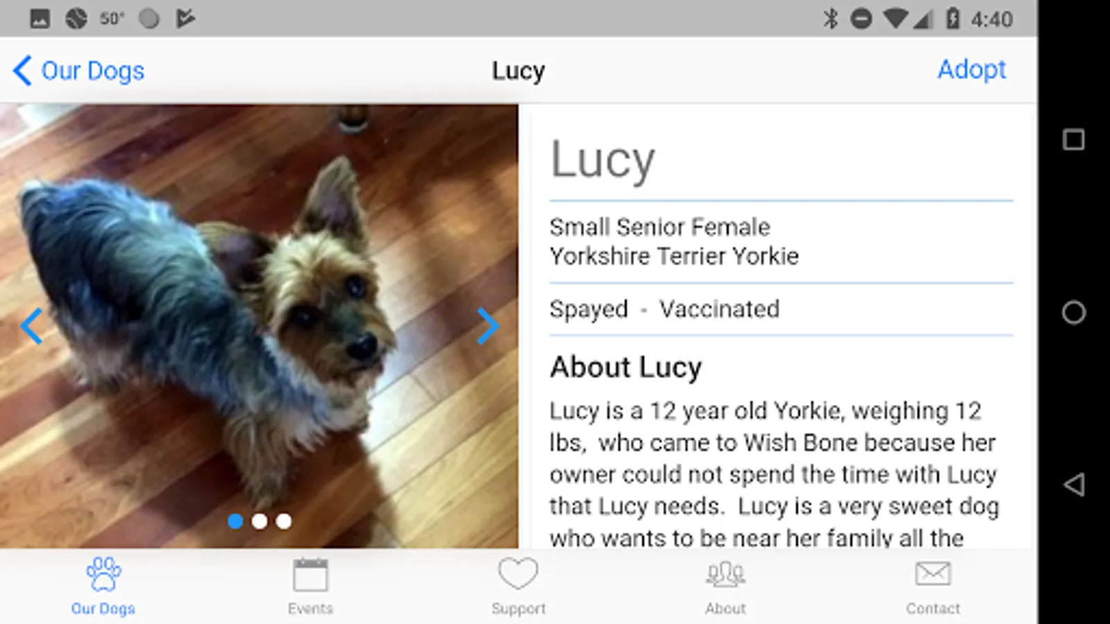 WishBone Canine Rescue is based in Bloomington-Normal, IL. Their mission is to rescue, care for, and rehome dogs. This application presents up-to-date images and information on WBCR's dogs available for adoption and connects to their adoption application form.