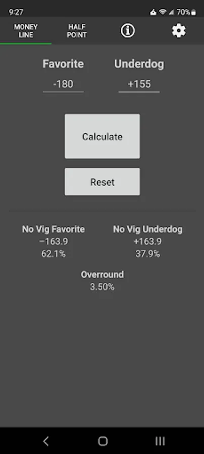 This no-frills app provides an easy way to take the vig off a betting line. It calculates the vig-free line, implied win probability, and the sportsbook's cut (overround). Use it to shop around for the best line or to find a fair line for a friendly wager. Works with both American and Decimal odds.