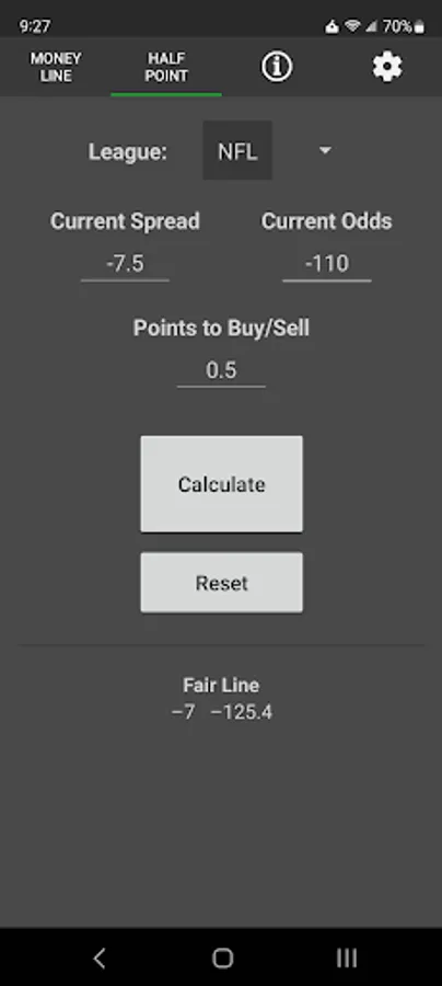 The app also calculates vig-free half point values for NFL, NCAAF, NBA, and NCAABK lines. Know how much books are overcharging when you buy points.
