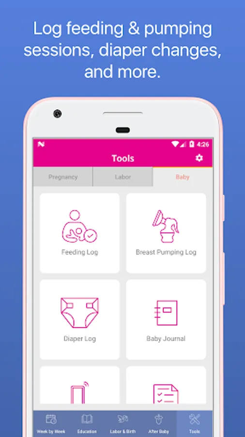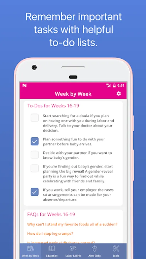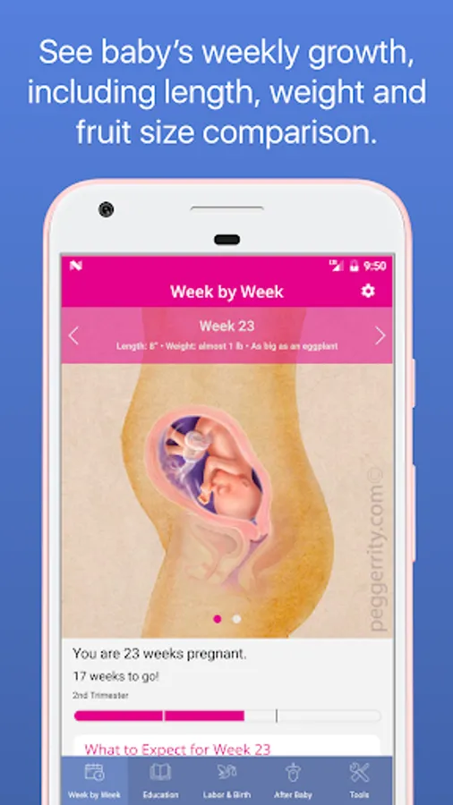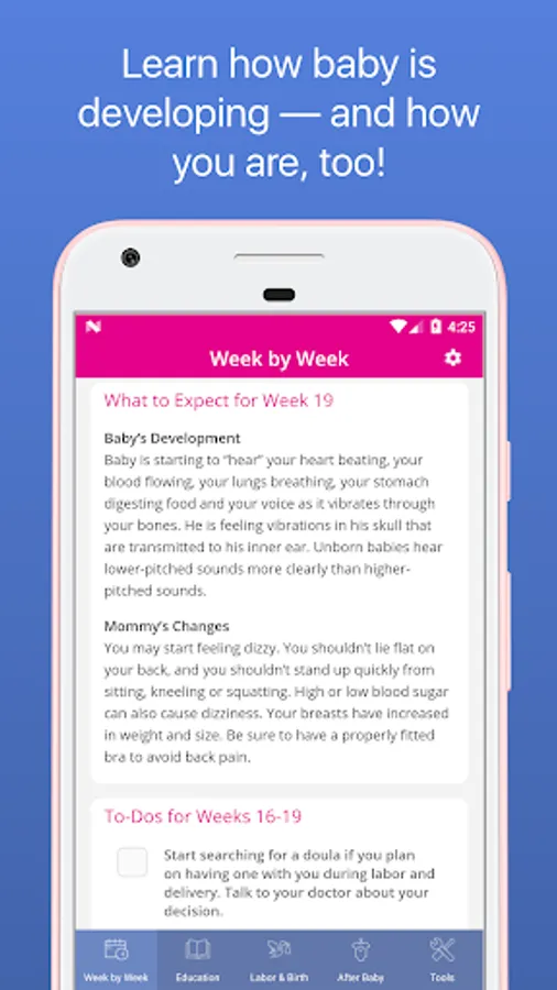 • Week-by- week baby development and mommy’s changes, including to-do lists