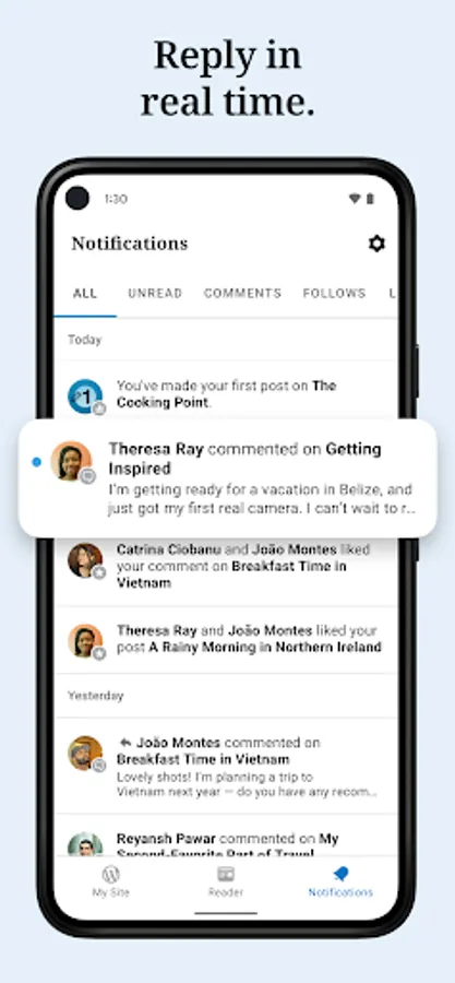 - Get notifications about comments, likes, and new followers so you can see people reacting to your website as it happens.