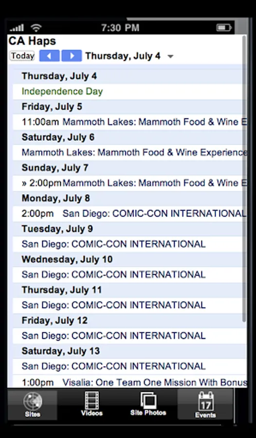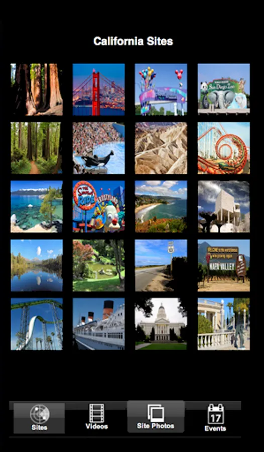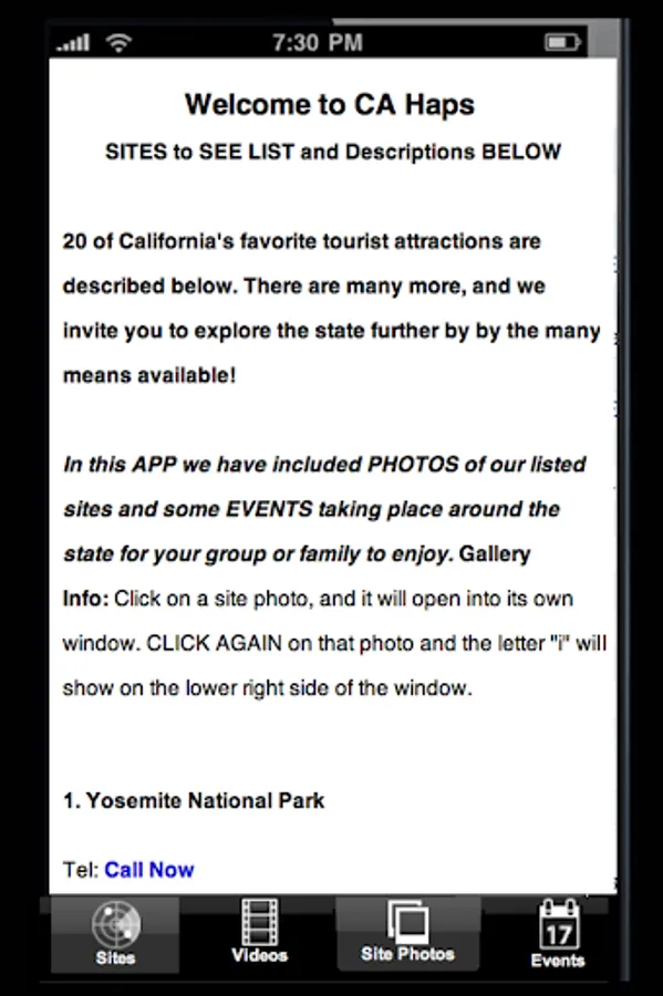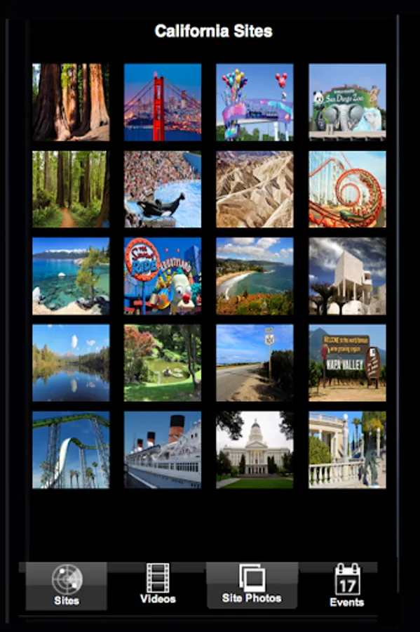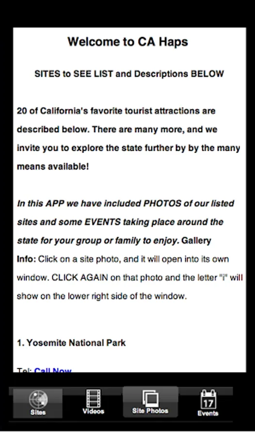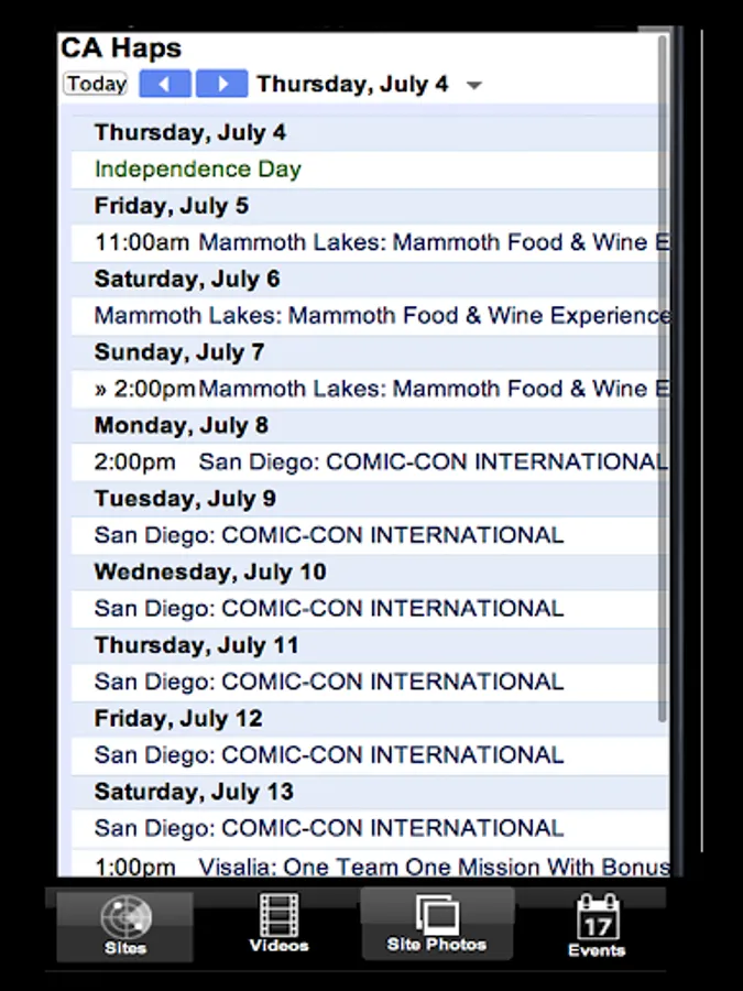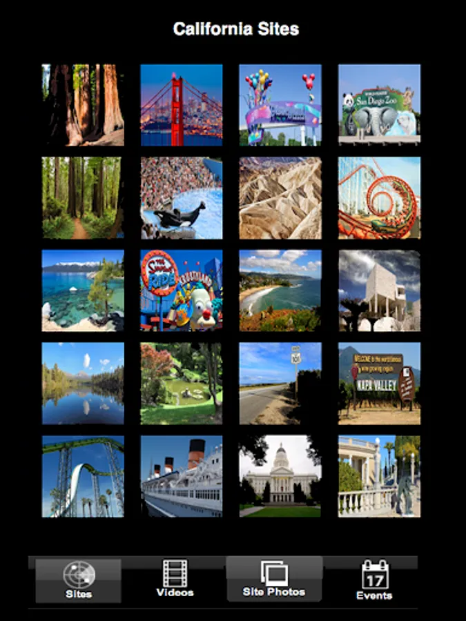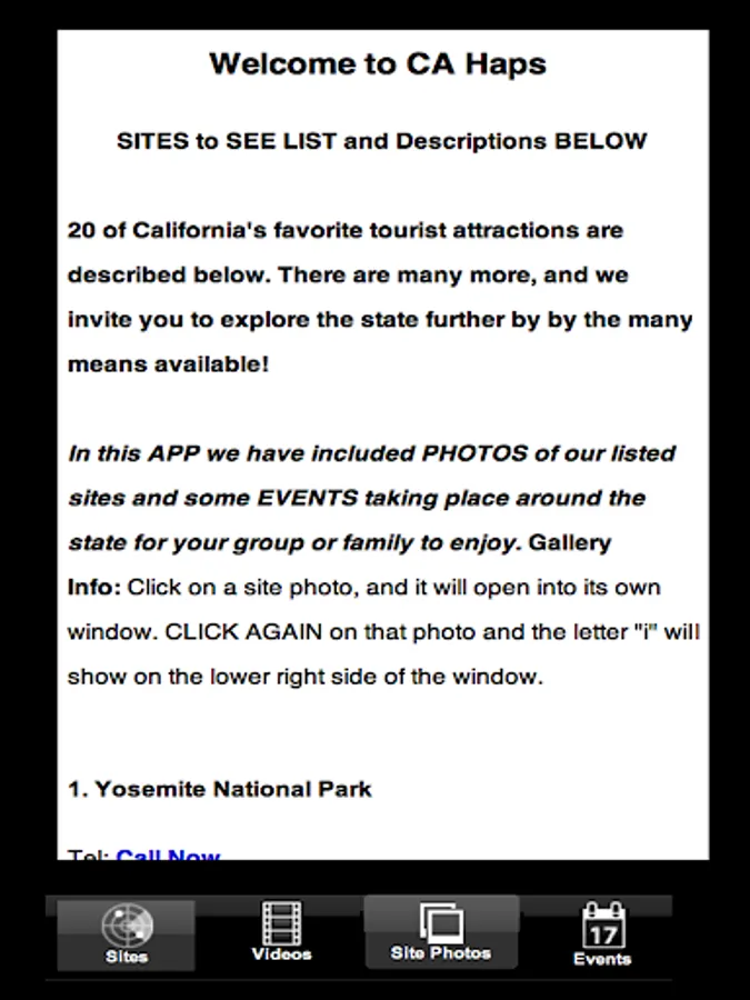 California events; sites to see; photos for those sites; travel videos. This events calendar will contain family-friendly events across the state. The 20 sites in the app are considered some of California's favorites...the photos are numbered identical to the 20 sites for your convenience. Videos are from various travel and tourism groups in CA. Produced by Word Productions LLC. A Hap App.