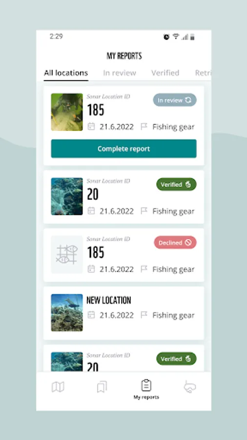 The app shows you potential positions of ghost nets on a map. With your support we will find out, whether the find really is a ghost net! Dive at the location and verify the position. With this important information, the recovery of lost fishing gear can be optimally prepared and the nets recovered by specially trained divers.