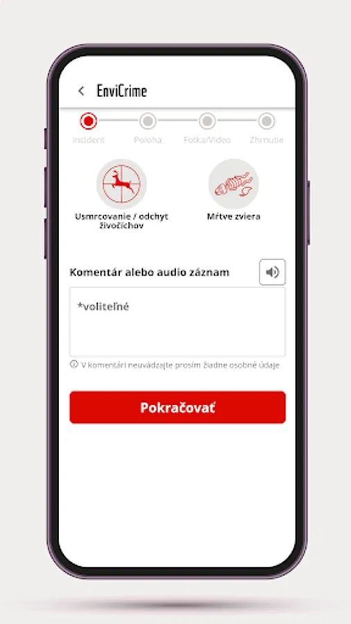Registration: Users can use the application without registration or register as anonymous users. The application does not collect any personal data or data related to the phone device. The application only collects information about illegal activity, geolocation of the incident location, photo, video, and audio documentation of the incident.