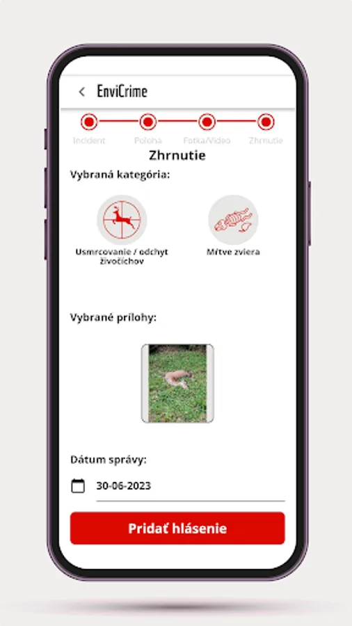 The goal of the application is to help law enforcement authorities detect this type of illegal activity and contribute to its elimination. Data on reported cases will be sent by encryption at regular intervals directly to the Police - Department of Detection of Hazardous Materials and Environmental Crime NCODK P PZ (so-called Enviropolicia), which will then deal with the relevant reports. All reports will be anonymous. You can read more about ensuring the anonymity of the reporter in the section "Guarantee of anonymity".