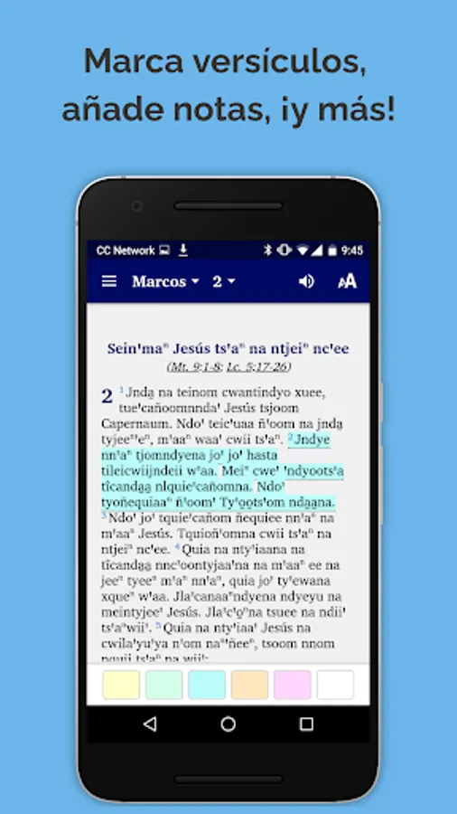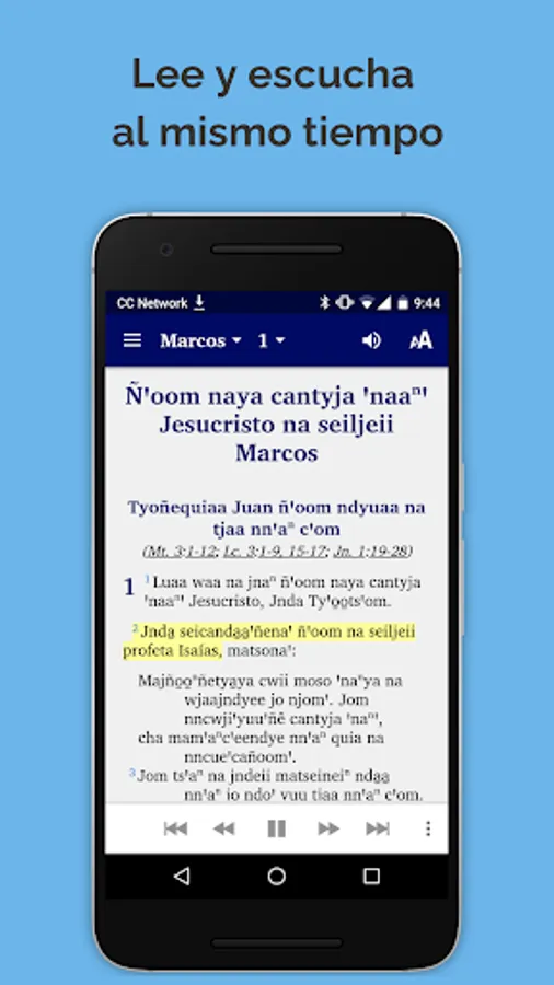 This app comes with audio and automatic text highlighting as the audio is played for books where audio is available. The Gospel of Mark audio is included in the intial installation. The audio for the other books will be downloaded from the web the first time the chapter is played. Internet provider data use charges may apply for downloading audio or watching linked videos.