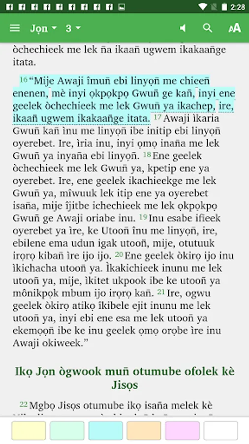 This app comes with audio and automatic text highlighting as the audio is played for books where audio is available. The app will download the audio from the web the first time the chapter is played. After that no further web connection is used or needed.