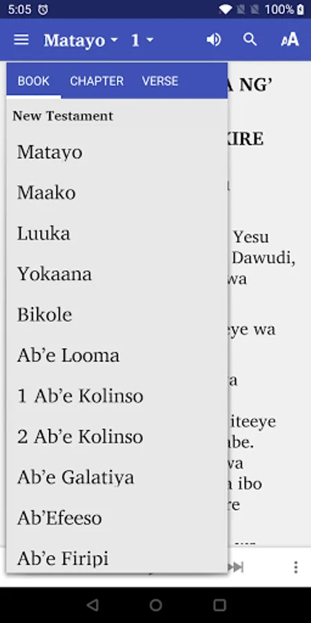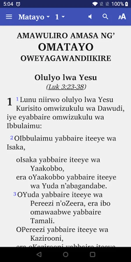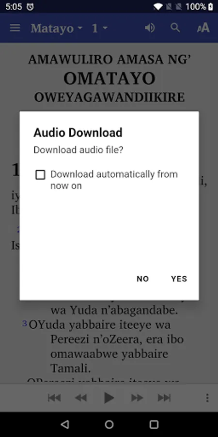 This app comes with audio and automatic text highlighting as the audio is played for. The app will download the audio from the internet the first time the chapter is played. After that no further internet connection is used or needed.
