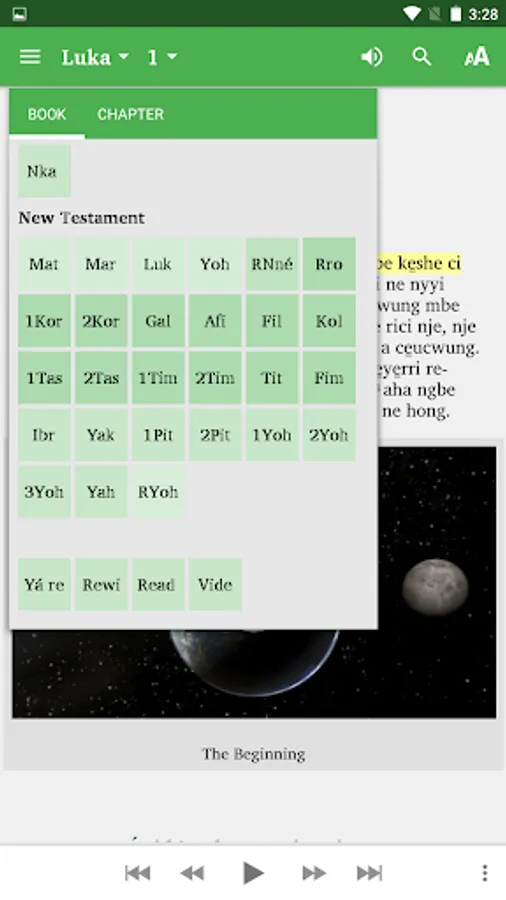 This app comes with audio and automatic text highlighting as the audio is played for books where audio is available. The app will download the audio from the web the first time the chapter is played. After that no further web connection is used or needed.