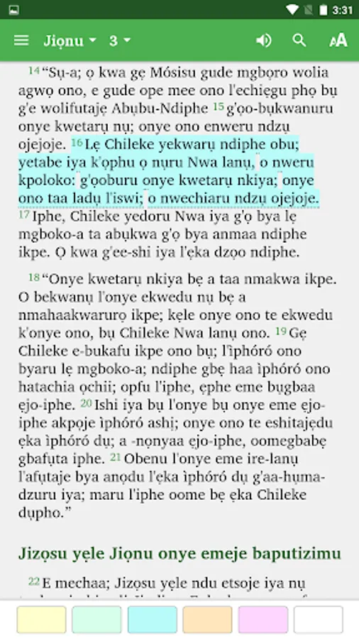 This app comes with audio and automatic text highlighting as the audio is played for books where audio is available. The app will download the audio from the web the first time the chapter is played. After that no further web connection is used or needed.