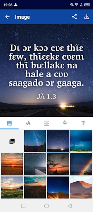 • When you tap on a verse, an image button is displayed on the bottom toolbar. When this button is pressed, the screen appears. You can choose the background image, move the text around the image, change the font, text size, alignment, format and color. the final image can be saved on the device and shared with others.