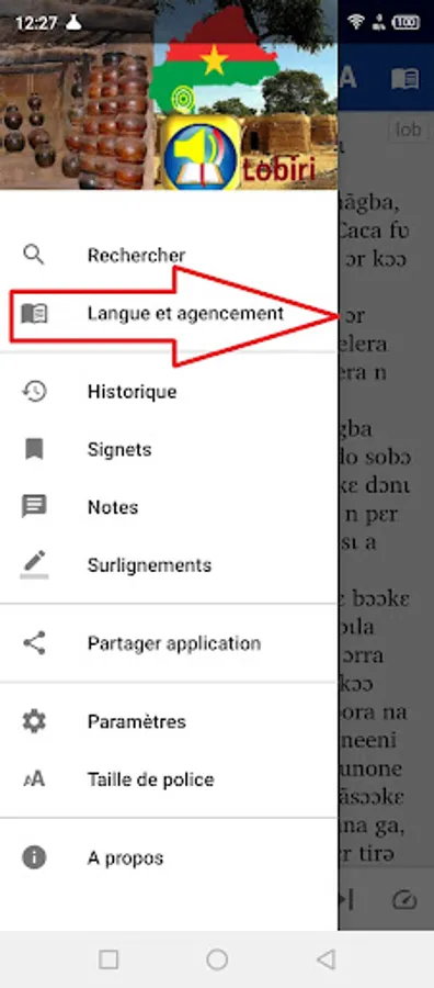 - "verse by verse" to display a verse in Lobiri followed by the same verse in French or in English.
