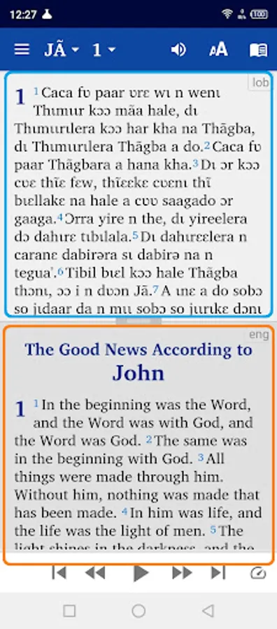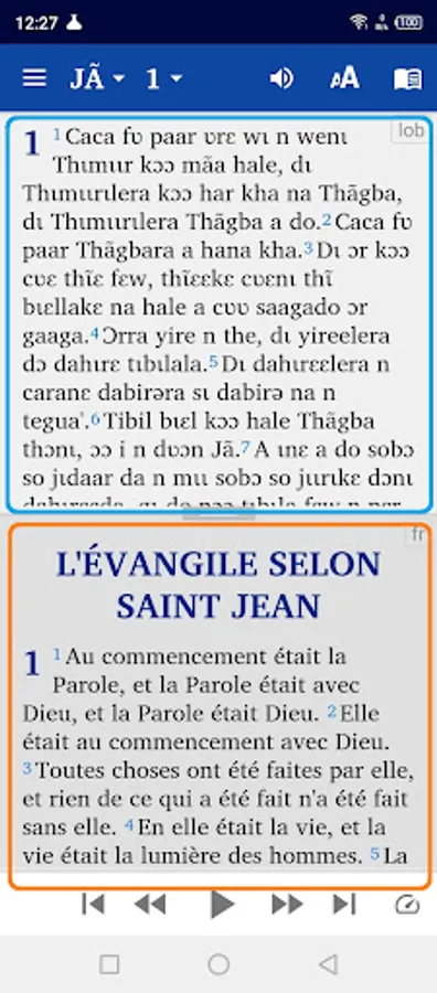- “verse by verse” to display a verse in Lobiri followed by the same verse in French or in English.