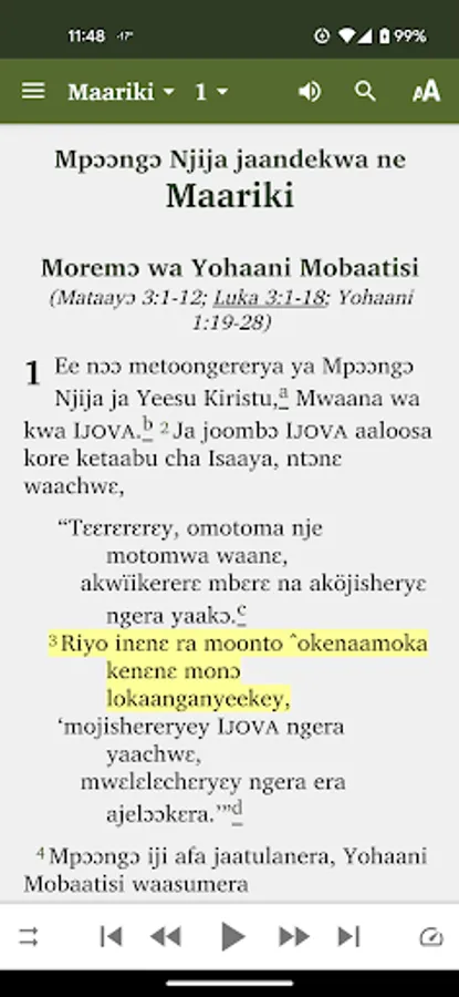 ✔ Audio is synced to the text, highlighting it phrase by phrase as the audio plays, allowing the user to read and listen to the Bible at the same time