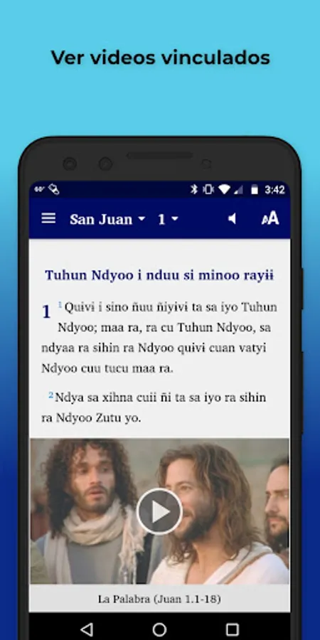 This app comes with audio and automatic text highlighting as the audio is played for books where audio is available. The Gospel of Mark audio is included in the initial installation. The audio for the other books will be downloaded from the web the first time the chapter is played. Internet provider data use charges may apply for downloading audio or watching linked videos.