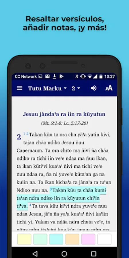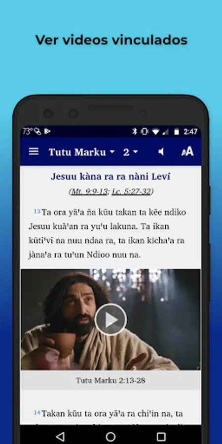 This app comes with audio and automatic text highlighting as the audio is played for books where audio is available. The Gospel of Mark audio is included in the initial installation. The audio for the other books will be downloaded from the web the first time the chapter is played. Internet provider data use charges may apply for downloading audio or watching linked videos.