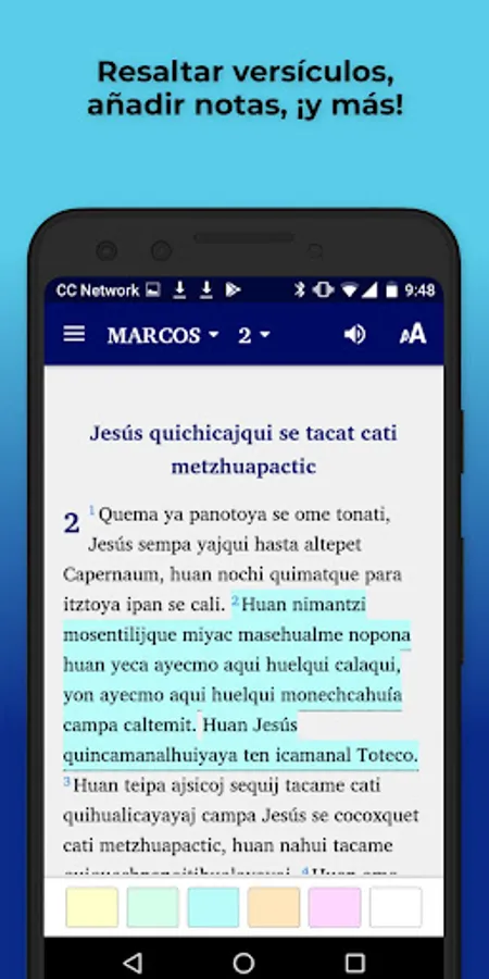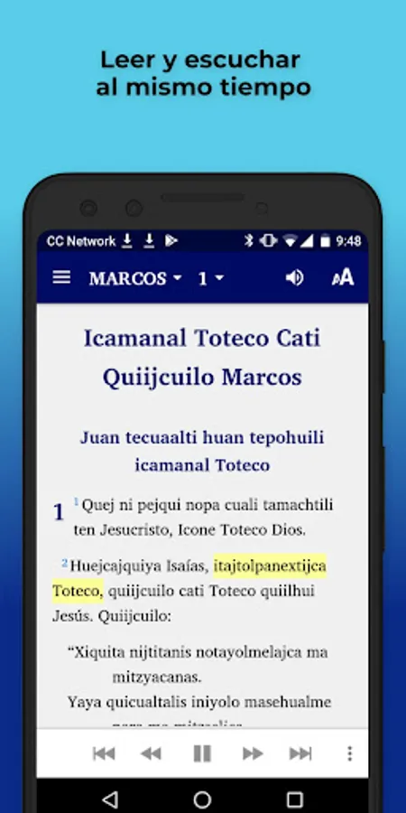 This app comes with audio and automatic text highlighting as the audio is played for books where audio is available. The Gospel of Mark audio is included in the initial installation. The audio for the other books will be downloaded from the web the first time the chapter is played. Internet provider data use charges may apply for downloading audio or watching linked videos.