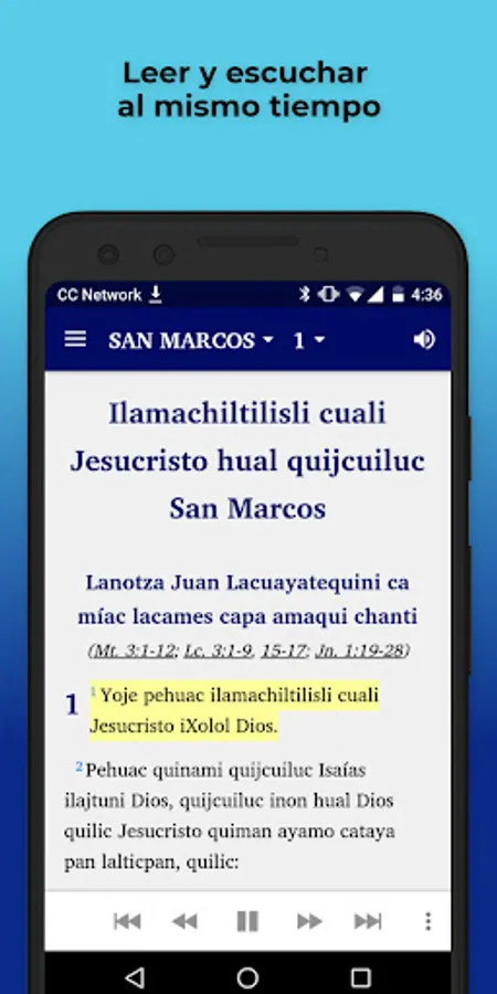 This app comes with audio and automatic text highlighting as the audio is played for books where audio is available. The Gospel of Mark audio is included in the initial installation. The audio for the other books will be downloaded from the web the first time the chapter is played. Internet provider data use charges may apply for downloading audio or watching linked videos.