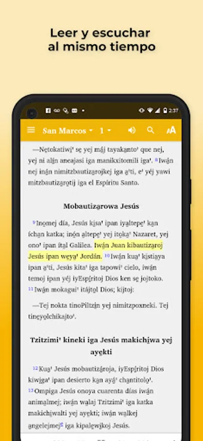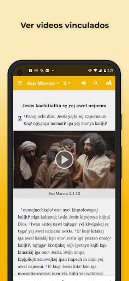 This app comes with audio and automatic text highlighting as the audio is played for books where audio is available. The Gospel of Mark audio is included in the initial installation. The audio for the other books will be downloaded from the web the first time the chapter is played. Internet provider data use charges may apply for downloading audio or watching linked videos.