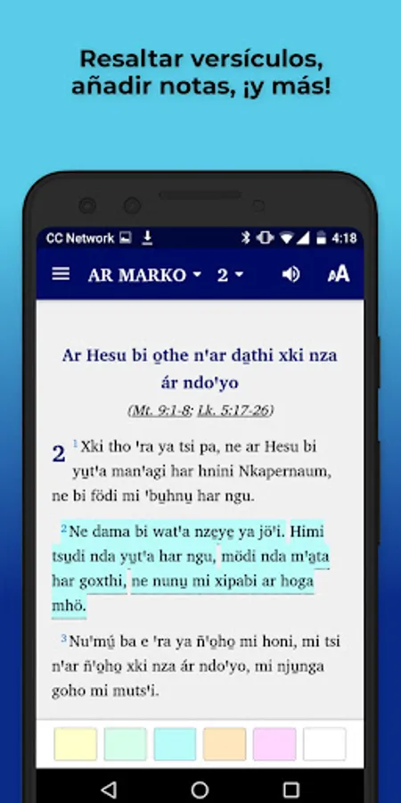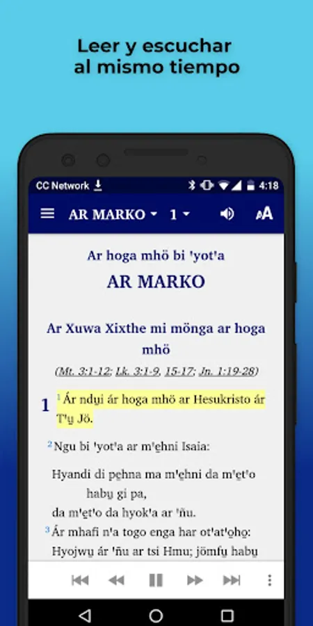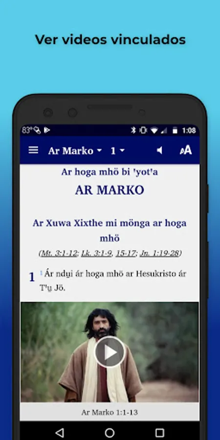 This app comes with audio and automatic text highlighting as the audio is played for books where audio is available. The Gospel of Mark audio is included in the initial installation. The audio for the other books will be downloaded from the web the first time the chapter is played. Internet provider data use charges may apply for downloading audio or watching linked videos.