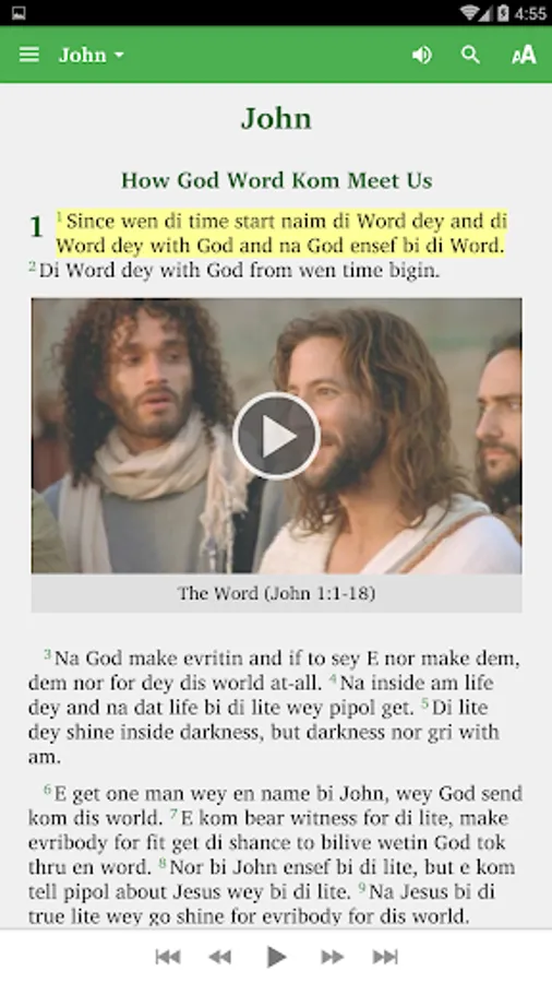 This app comes with audio and automatic text highlighting as the audio is played for books where audio is available. The app will download the audio from the web the first time the chapter is played. After that no further web connection is used or needed.