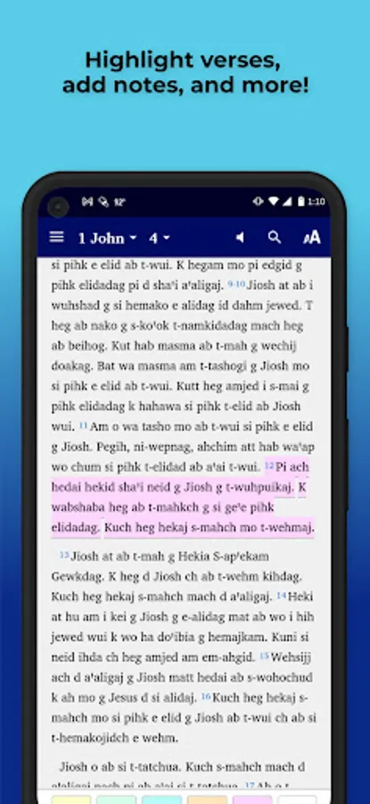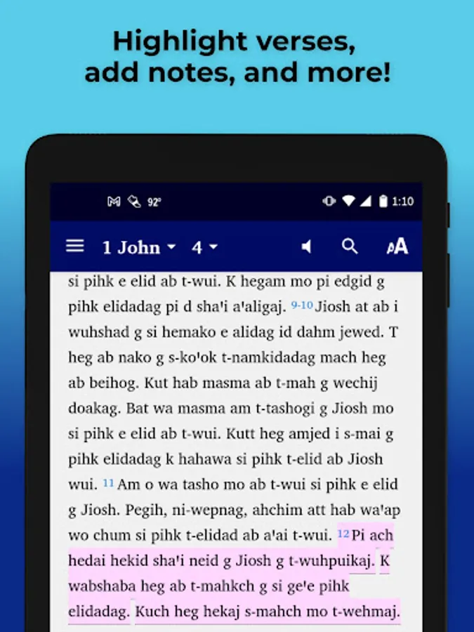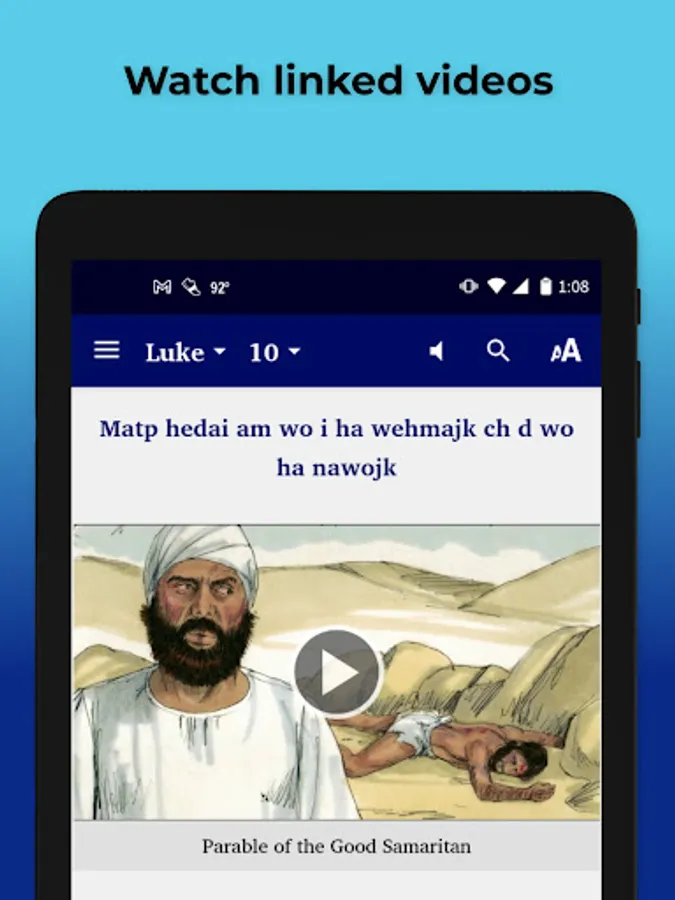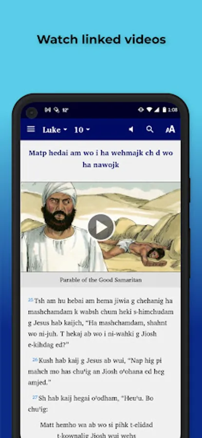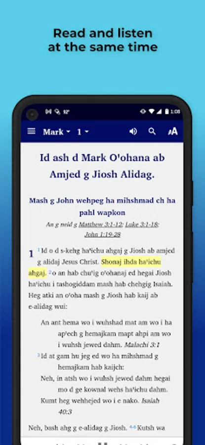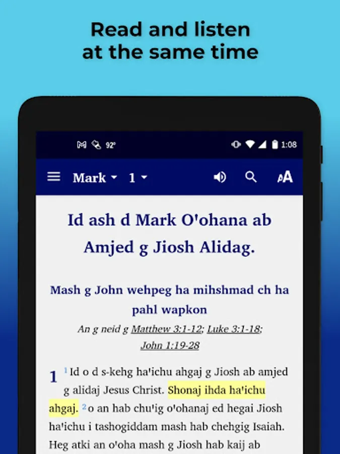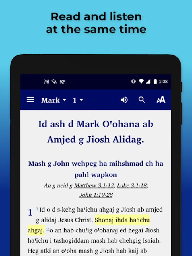 This app comes with audio and automatic text highlighting as the audio is played for books where audio is available. The Gospel of Mark audio is included in the initial installation. The audio for the other books will be downloaded from the web the first time the chapter is played. Internet provider data use charges may apply for downloading audio or watching linked videos.