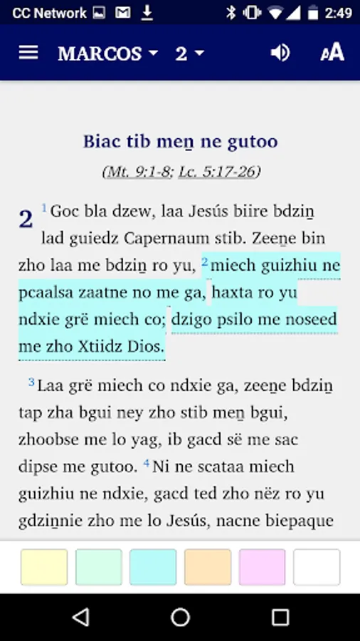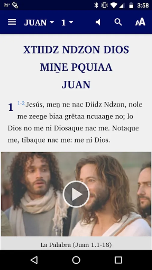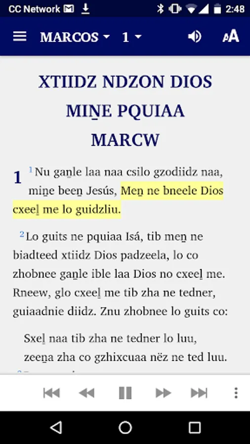This app comes with audio and automatic text highlighting as the audio is played for books where audio is available. The Gospel of Mark audio is included in the intial installation. The audio for the other books will be downloaded from the web the first time the chapter is played. Internet provider data use charges may apply for downloading audio or watching linked videos.