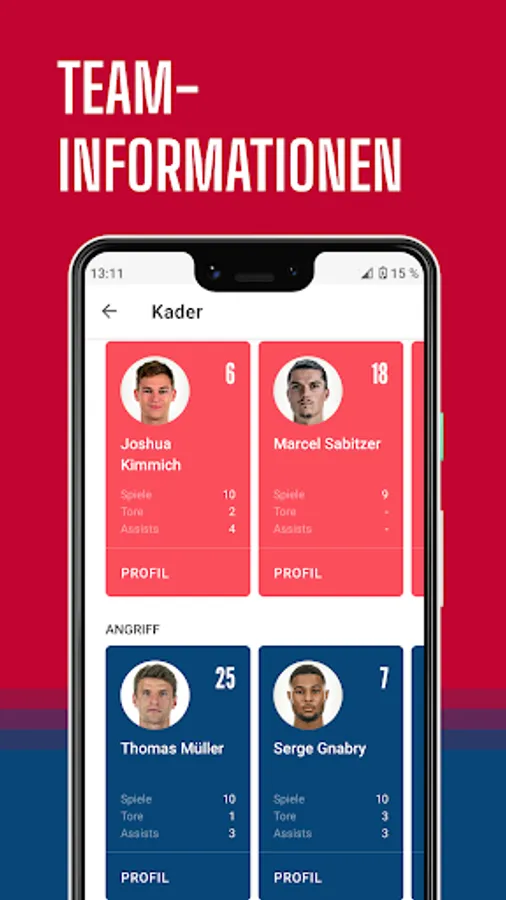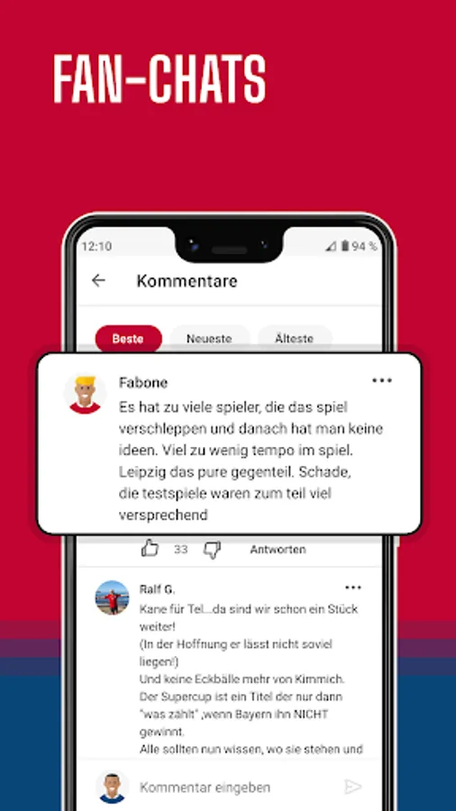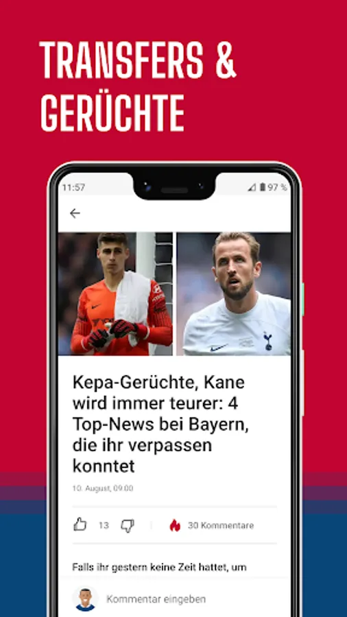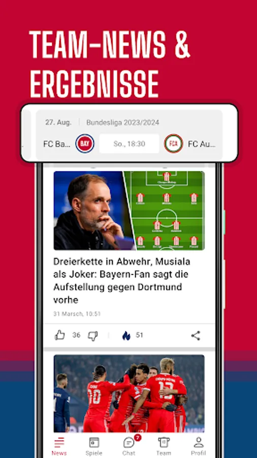 You will immediately know everything related to FC Bayern Munich! From the latest news, fixture list and results to goal notifications, best editorial articles, fan chat, commentary and even tools to create your own posts — all the essentials for a true Reds fan!