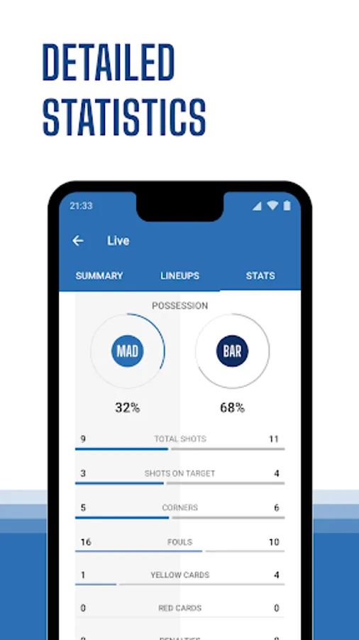 ✔ Adjustable push notifications for top news, lineups, kickoff, goals, yellow and red cards, results. Silent mode is available as well.