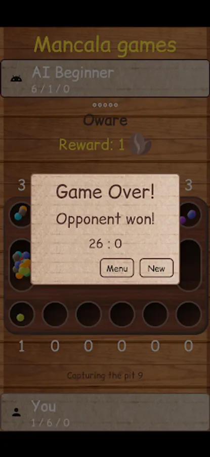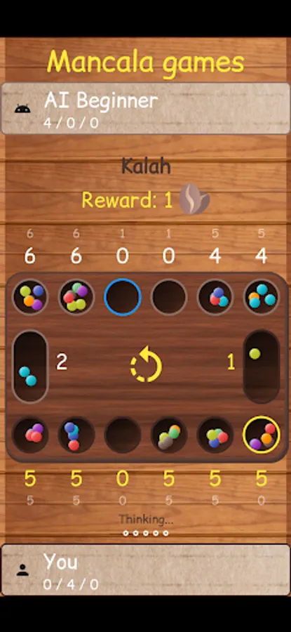 6. When one player no longer has any seeds in any of their houses, the game ends. The other player moves all remaining seeds to their store, and the player with the most seeds in their store wins.