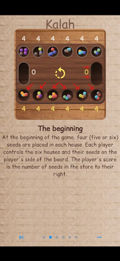 1. At the beginning of the game, four (five or six) seeds are placed in each house. Each player controls the six houses and their seeds on the player's side of the board. The player's score is the number of seeds in the store to their right.
