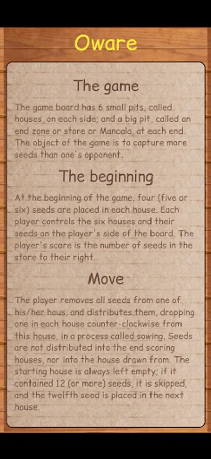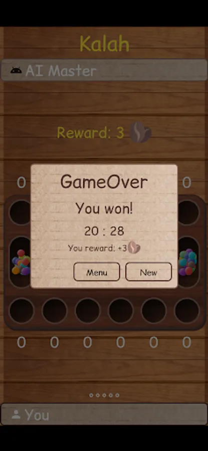 6. When one player no longer has any seeds in any of their houses, the game ends. The other player moves all remaining seeds to their store, and the player with the most seeds in their store wins.