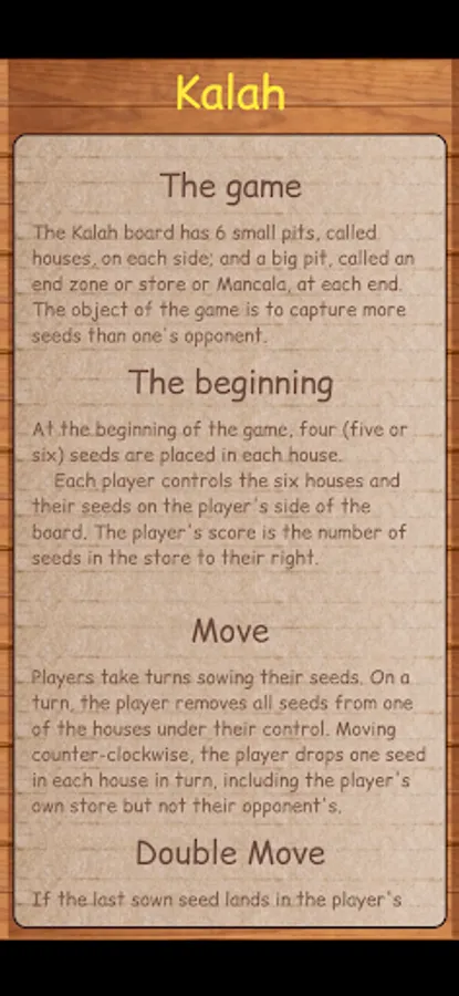 The game provides a board and a number of seeds or counters. The board has 6 small pits, called houses, on each side; and a big pit, called an end zone or store, at each end. The object of the game is to capture more seeds than one's opponent.
