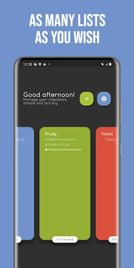 tDo is the simplest checklist app that allows you to organize your todos, shopping lists, and more in simple and beautiful lists. Create unlimited checklists and to-do lists and keep track of your open tasks.