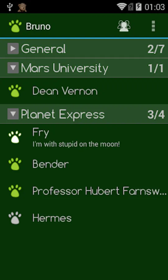 Bruno is the cutest Jabber/XMPP Instant Messaging (IM) app available. It is a themed version of the open source yaxim app.