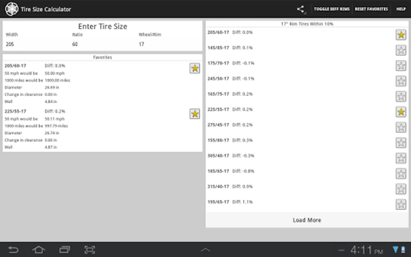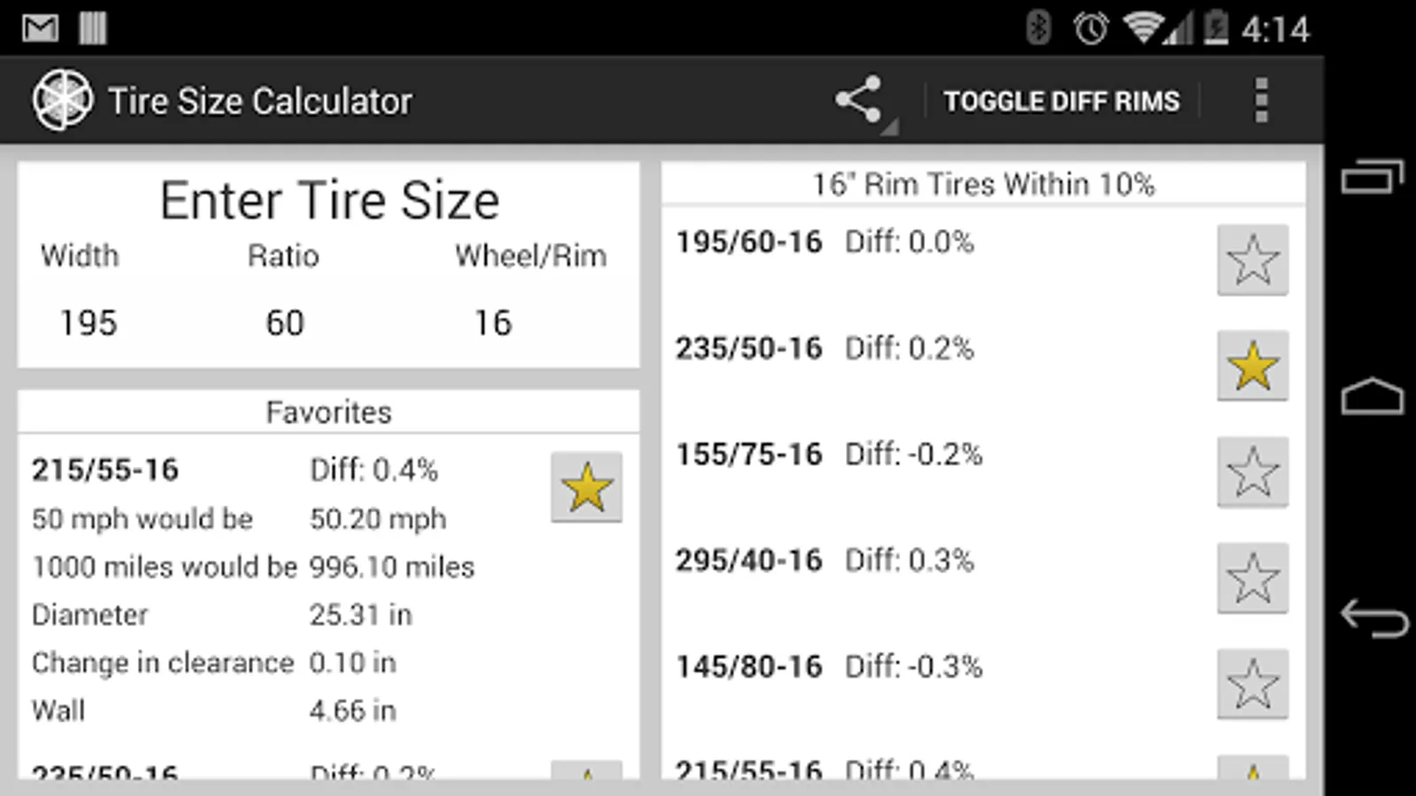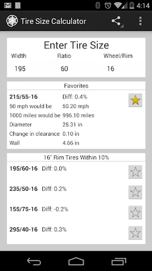 Enter your current tire's parameters (ie: 205/60-16) and you will see a list of tires sorted based on similarity.