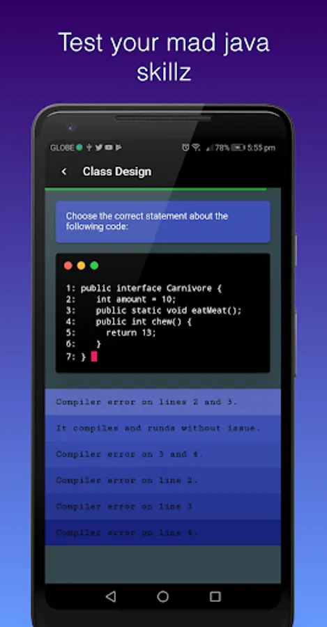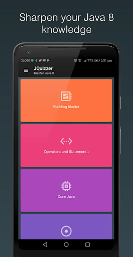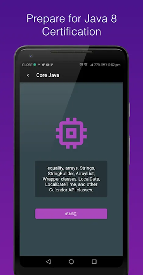 This app was written as handy tool for practising and challenging your Java 8 knowledge presented in a quiz-like format. Topics covered are aligned with OCAJP 8: Java SE 8 Programmer 1 Certification.