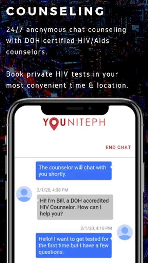 YOUnitePH will soon offer 24/7 anonymous chat service with DOH accredited HIV/Aids counselors & will also allow users to book private HIV screening in their most convenient time & location.