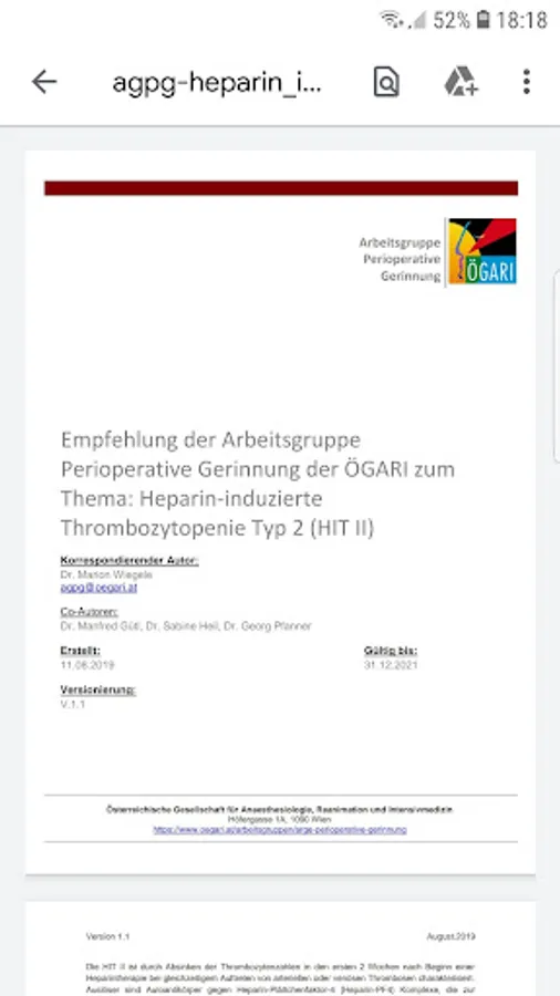 This app provides a direct link to the homepage of the ÖGARI Working Group Perioperative Coagulation (AGPG) / section Downloads. The recommendations of the AGPG can be freely downloaded there. The recommendations are updated regularly; Please make sure that you use the current version. Please send feedback and correspondence to: agpg@oegari.at