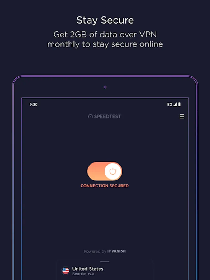 Keep your online connection private and secure with Speedtest VPN™. Use up to 2GB of data over VPN per month for free, or go Premium with unlimited usage for just $4.99 monthly. Speedtest VPN Premium users will also receive no advertisements while their subscription is active.