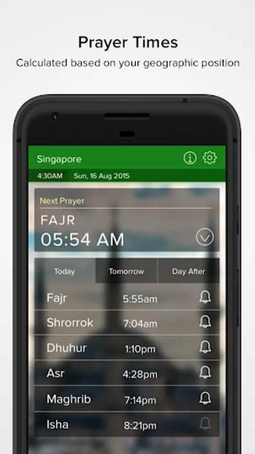 - Automatically the upcoming prayer time and prayer times for the next few days