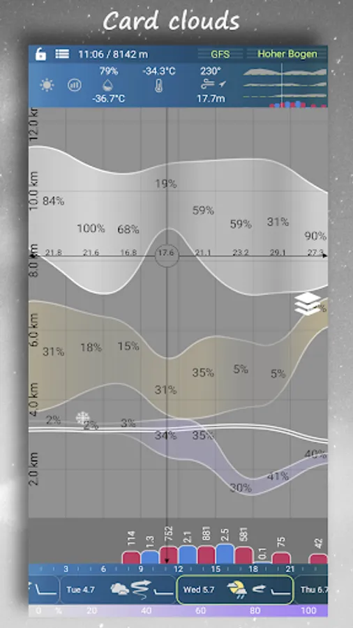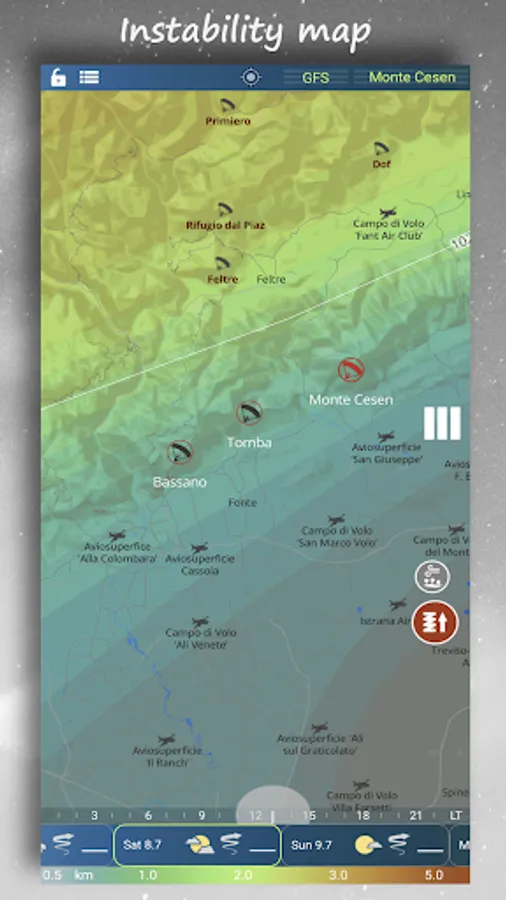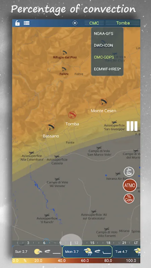 You can display clouds on maps separately or combine them for each floor. The Cape index allows you to make the most of the day while avoiding storms.