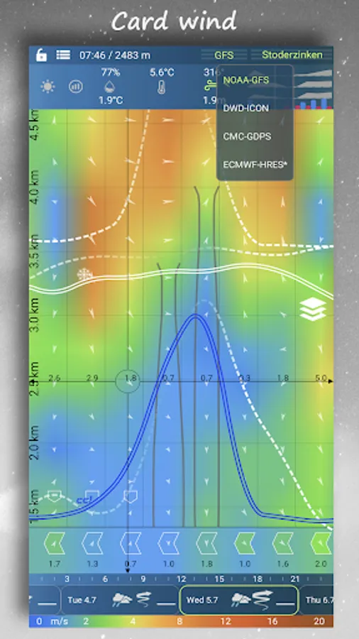 In a clear vertical profile from the ground up to a height of about 12 km, the basic parameters such as force (color scale is adapted to flying) and wind direction, gusts and temperature, humidity and dew point are displayed.
